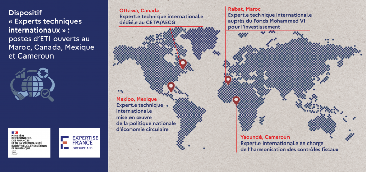 Mandatée par la Direction générale du Trésor, Expertise France recrute 4 expert.es (ETI) pour des missions au Maroc, au Canada, au Mexique et au Cameroun dans les secteurs de l’investissement, du commerce international, de l’économie circulaire et du contrôle fiscal. Ces postes d’ETI visent à renforcer la coopération économique bilatérale de la France avec le Maroc (investissements) et le Canada (commerce international), et à soutenir les politiques publiques, en accompagnant la politique d’économie circulaire au Mexique et en appuyant le Cameroun dans l’amélioration de ses dispositifs de contrôle fiscal.