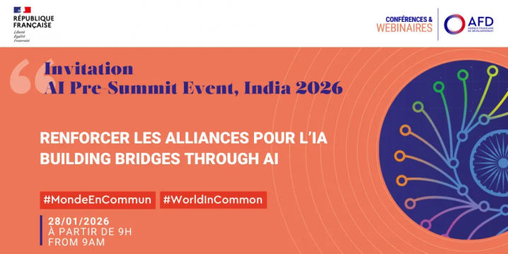 Le Groupe AFD, aux côtés de ses partenaires, vous invite à suivre en direct l’événement « Renforcer les alliances pour l’IA », qui se tiendra le mercredi 28 janvier, de 9h à 13h. Cet événement prépare le lancement de l’AI Impact Summit 2026, qui se tiendra à New Delhi, et s’inscrit dans le prolongement du Sommet pour l’Action sur l’IA (Paris 2025). Il rassemblera des décideurs publics, des experts internationaux et des acteurs de l’innovation d’Afrique, d’Inde et de France afin d’examiner les leviers de coopération en faveur d’une IA durable, juste et souveraine.